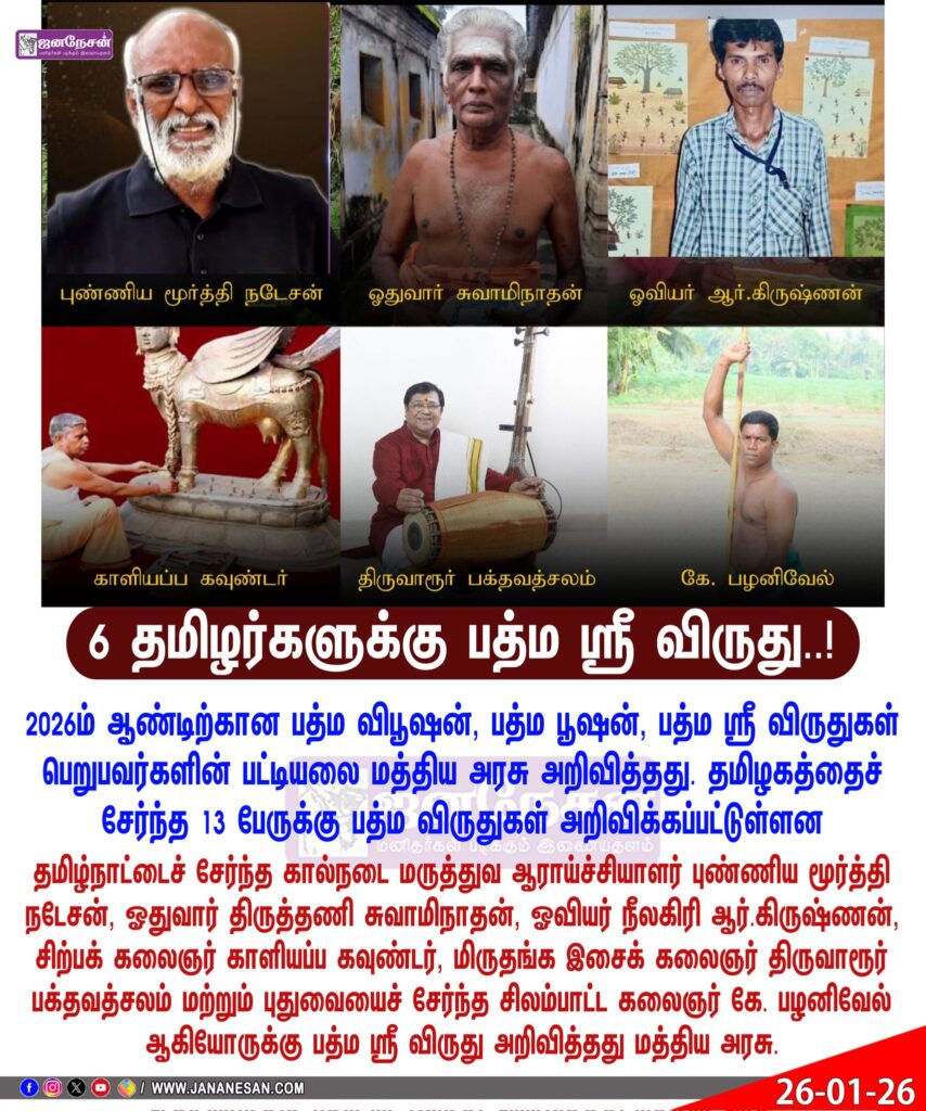 5 பேருக்கு பத்ம விபூஷண்:இந்தி நடிகர் தர்மேந்திரா (மறைவு), உச்ச நீதிமன்ற முன்னாள் நீதிபதி கே.டி.தாமஸ், வயலின் கலைஞர் என்.ராஜம், பி.நாராயணன் (இலக்கியம், கல்வி), கேரள முன்னாள் முதல்வர் அச்சுதானந்தன் (மறைவு) ஆகிய 5 பேர் பத்ம விபூஷன் விருதுக்கு தேர்வாகி உள்ளனர்.